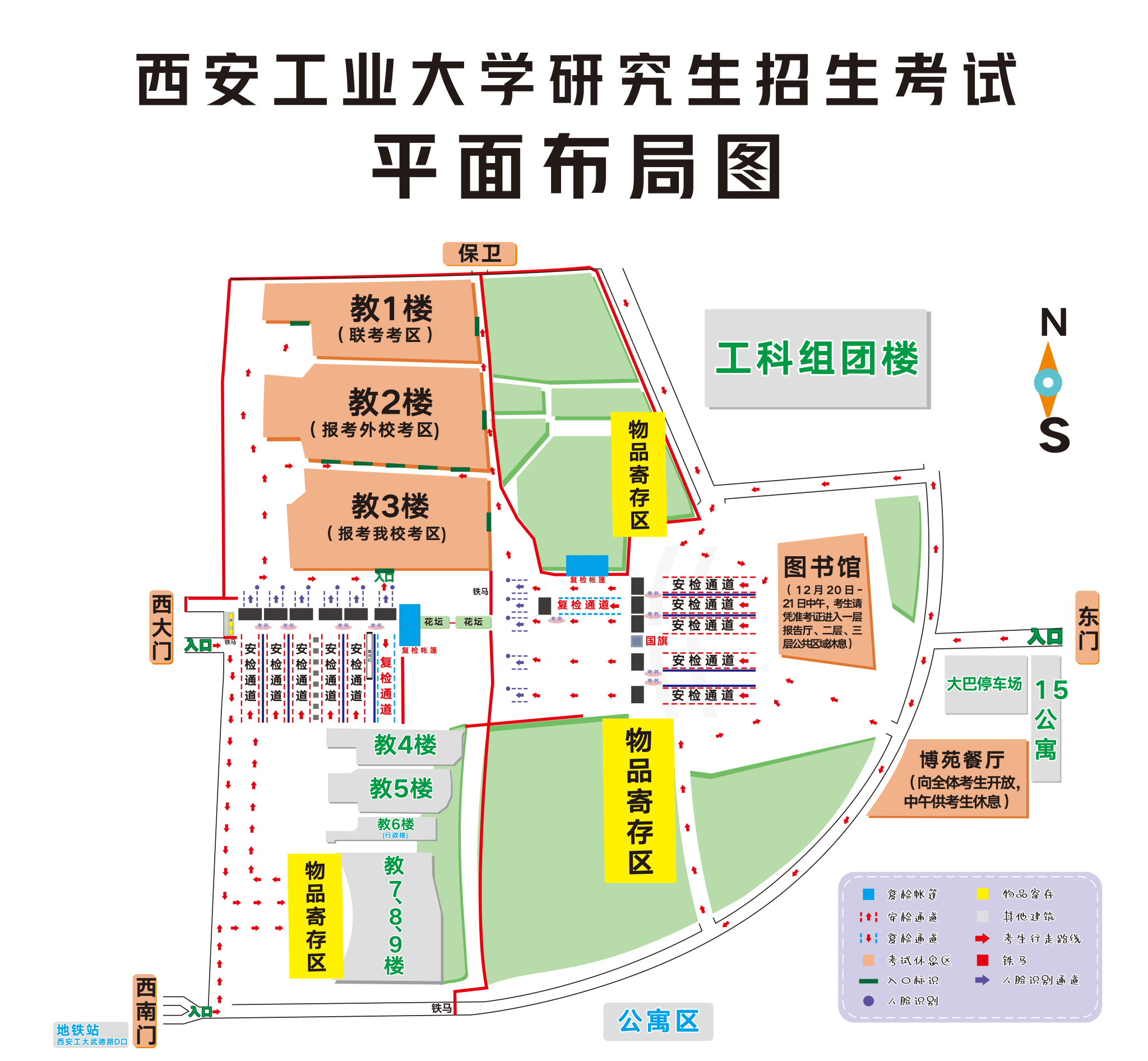 校外考生凭准考证、身份证从学校西大门、西南门、东门入校。校外送考车辆一律不得入校。